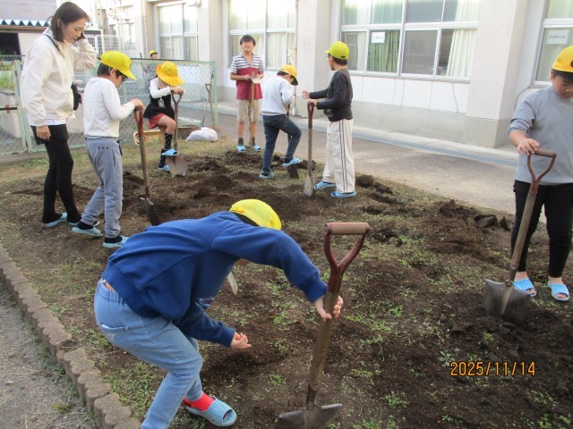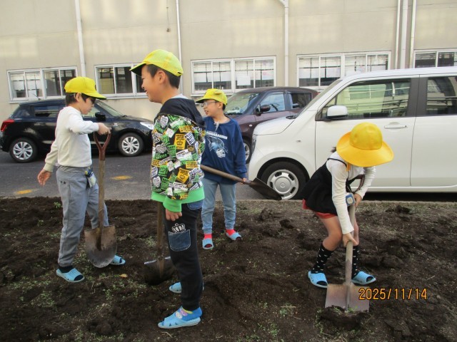 また6時間目に畑を耕しました。腐葉土を入れて混ぜて天地返しを行い、冬の野菜の