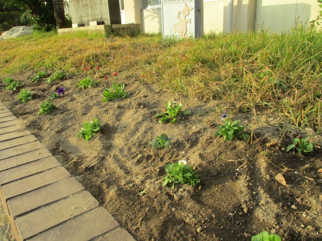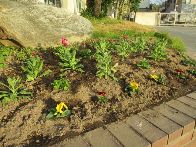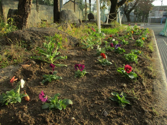 花のボランティアの方にお手伝いをいただき、花の苗を植えました。寒い冬でも、しっかりと咲くように水や肥料を与えていきたいと思います。