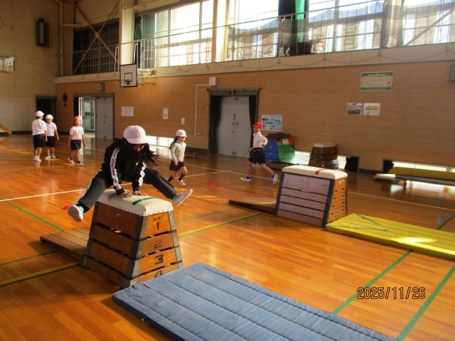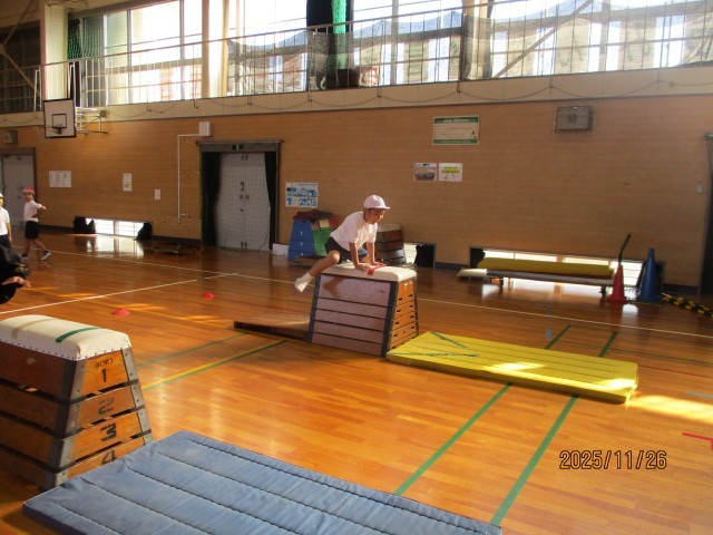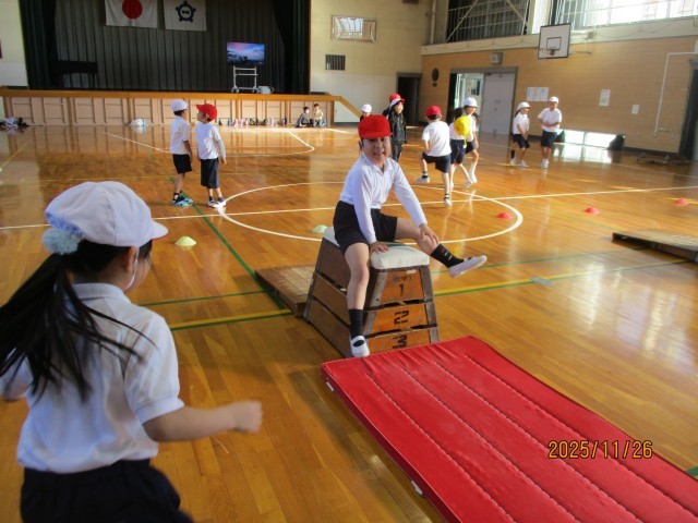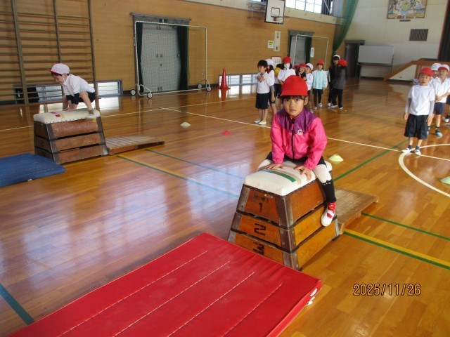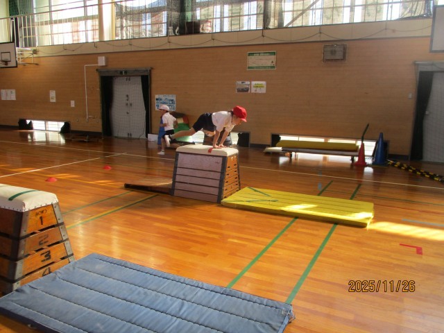 とび箱の練習を頑張っています。強く踏み切り、奥に手をついて、しっかりと着地までできるように繰り返し挑戦しています。