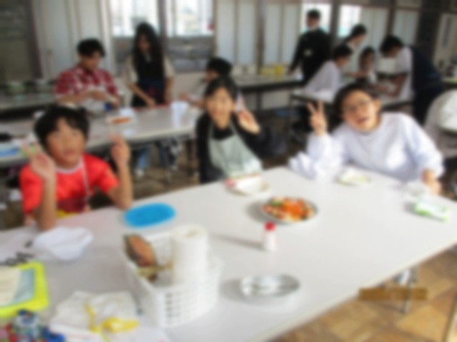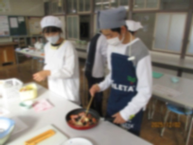 今日、調理実習をした学級も、これまでの家庭科の学習をいかして調理を進めました。味付けが濃くなってしまったり、野菜のベーコン巻きがくずれてしまったりするトラブルはありましたが、自分たちが作った料理はおいしそうに食べていました。