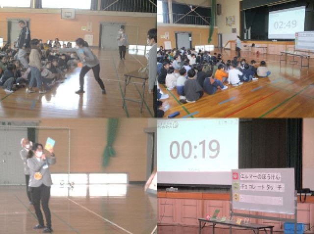 午前中は暖かい日差しがあり、運動場では楽しくドッチボール、縄跳びや持久走をしました。そして、体育館ではマット運動です。しかし、午後は雨模様の空となり、パラパラと雨も降ってきました。午後の体育館では一宮中央図書館の方がビブリオバトルについて説明と、実演をしてくださいました。