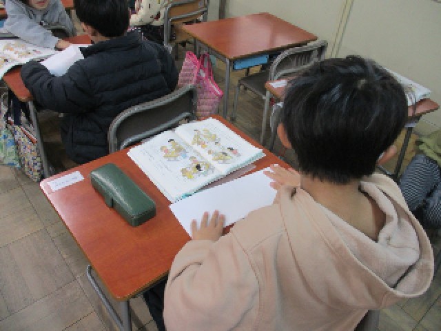1年生は国語の授業で、ものの名前について学習しています。今日は覚えた名前やイラストを画用紙に書いて、お店屋さんごっこをする準備をしました。食べ物や、楽器、花などいろいろなものを書いていました。