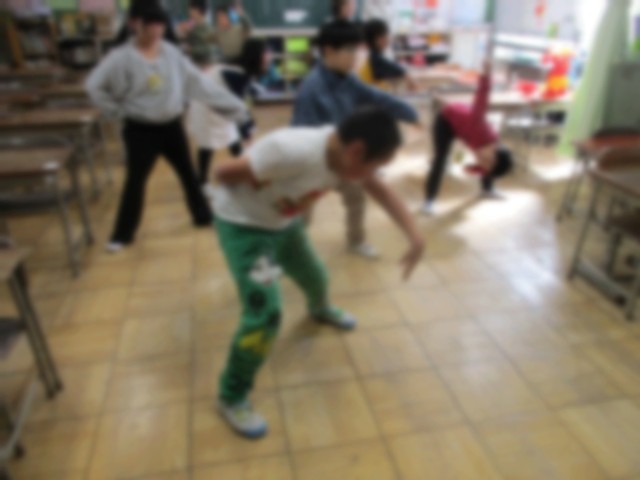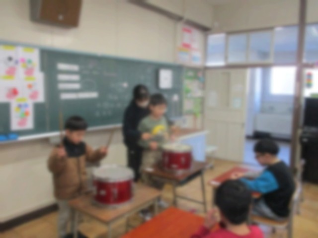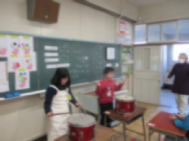 音楽の授業に、「チャチャマンボ」に合わせてたいこでリズム打ちをしました。たいこを初めてたたく子もいましたが、みんな楽しんでいました。ダンスも元気いっぱい踊りました。5時間目は英語でした。ペアであいさつの歌を歌ったり、アルファベットを聞いてゲームをしたりしました。