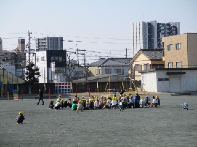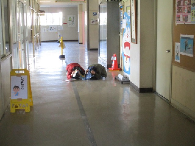 休み時間に地震が起きた場合の訓練を行いました。教室では机の下に、運動場では真ん中に集まって、廊下などではガラスなどから離れてシェイクアウトの姿勢をとることができました。
