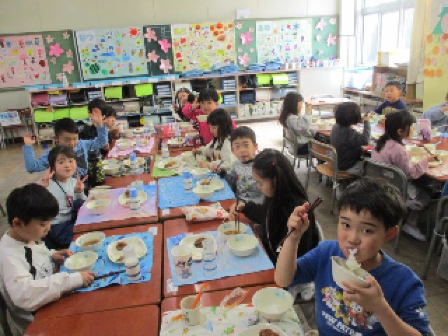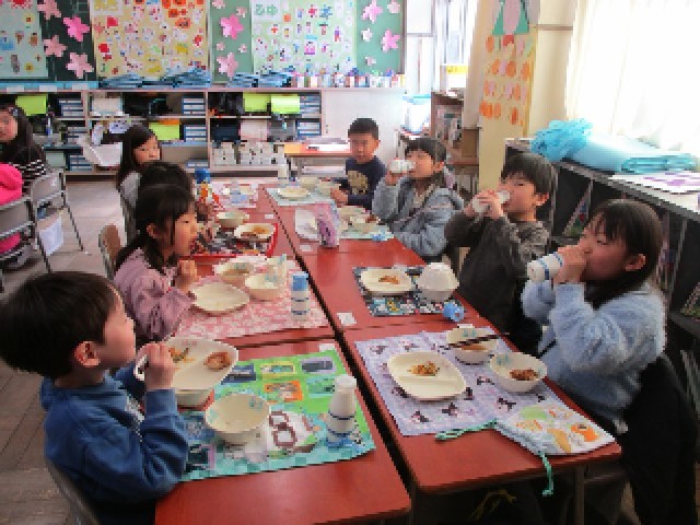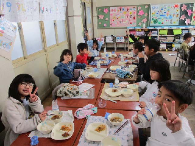 今日はにこにこ給食の日でした。みんなでおいしい給食を、楽しく食べました。同じクラスで過ごす時間も残りわずかとなってきました。毎日楽しく、仲良くすごせるようにしていきます。