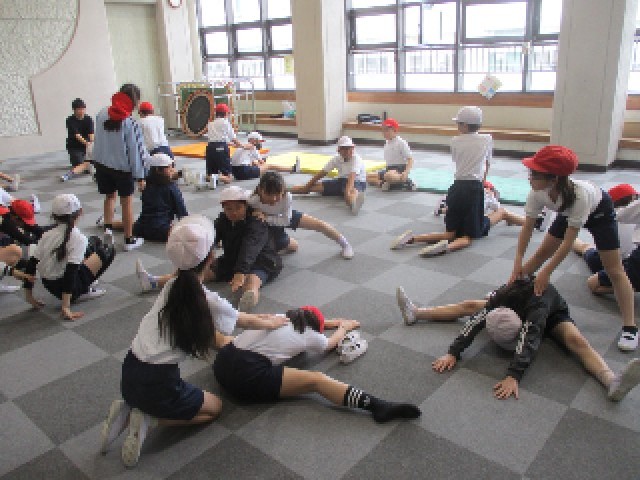 雨が降ったりやんだりで、運動場の状態がよくなかったため、室内で体ほぐしやストレッチ、簡単な体づくり運動を行いました。ペアを組んで、楽しく取り組むことができました。