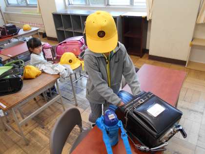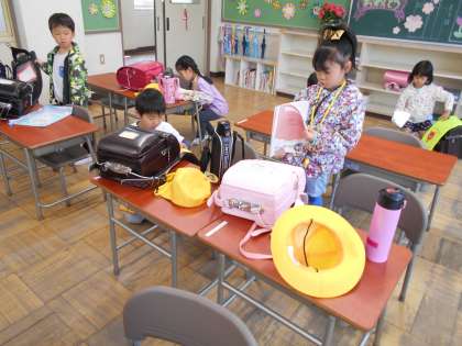 ペアのお兄さん、お姉さんに優しく手を引いてもらいながら登校してくる1年生の子どもたちですが、教室に入ってからは、自分のランドセルや荷物を自分で片づけて頑張っています。覚えること、学ぶことがたくさんありますが、少しずつ学校生活に慣れていってほしいと思います。