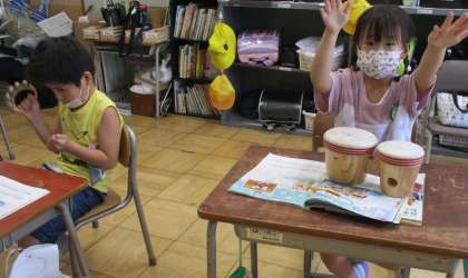 音楽の時間に、「おとのマーチ」を歌いました。いろいろな楽器の中から、大きな音、かわいい音、不思議な音を探しました。ボンゴやマラカス、カスタネット、トライアングル、鈴‥‥。いろんな音があって、曲に合わせて楽しく鳴らしました。