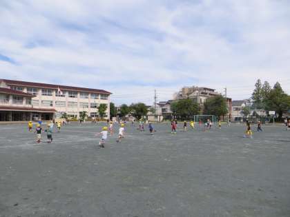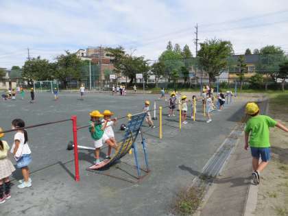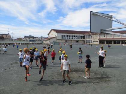 台風の風がまだ残っていましたが、お昼の運動場の熱中症指数(WBGT)が25.0と低かったため、久しぶりに外遊びができました。