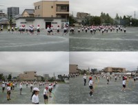 運動場では1年生と5年生が演技の場所の確認をしています。天気は、少しずつ雲が広が...