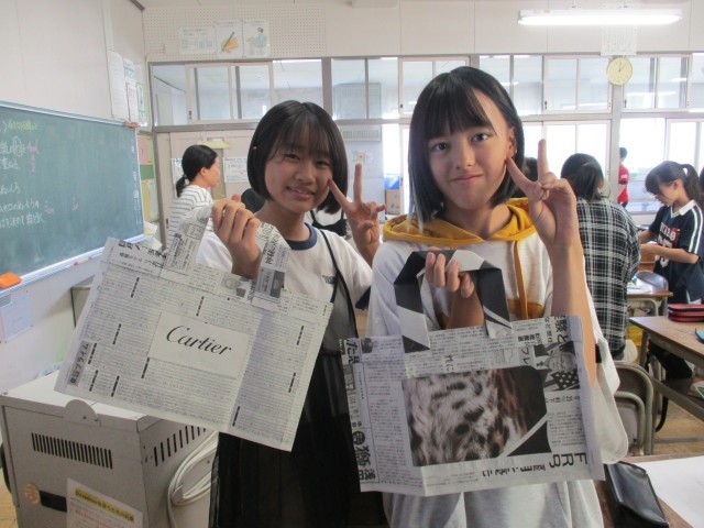 家庭科の授業で、新聞紙を使ってかばんを作りました。新聞紙を折ったり切ったり重ねたりしながら、丁寧に仕上げていました。完成した作品を見て満足そうな顔をしていました。