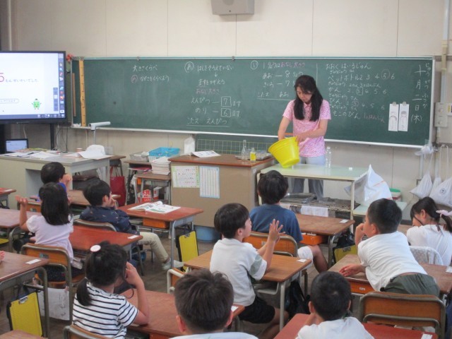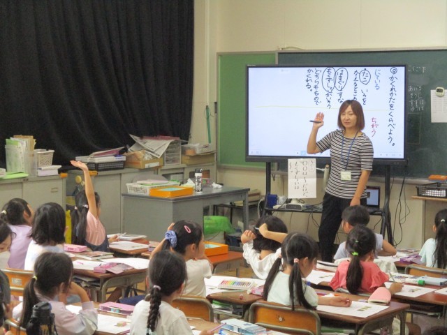 1年生もパソコンでまとめたことをみんなの前で発表しています。