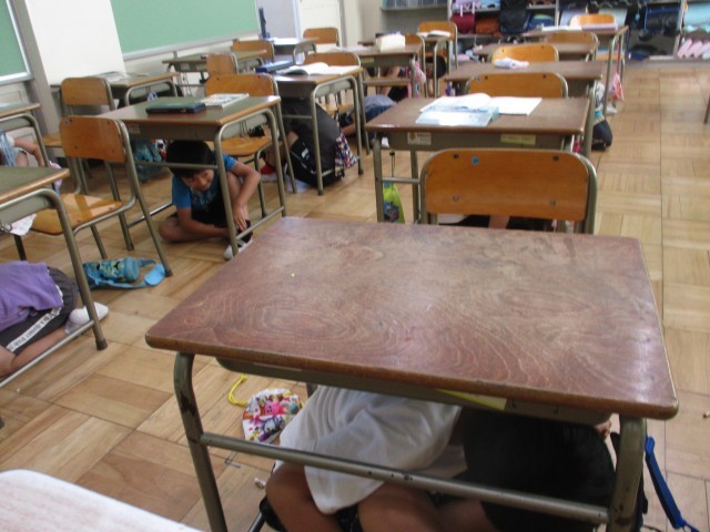 今回は、南海トラフ地震が発生し、理科室から出火したという想定で避難訓練を行いました。地震発生のアナウンスが聞こえると、子ども達はすばやく机の下にもぐって自分の身を守り、「おさない・はしらない・しゃべらない・もどらない」というめあてを意識して運動場まで避難をしました。