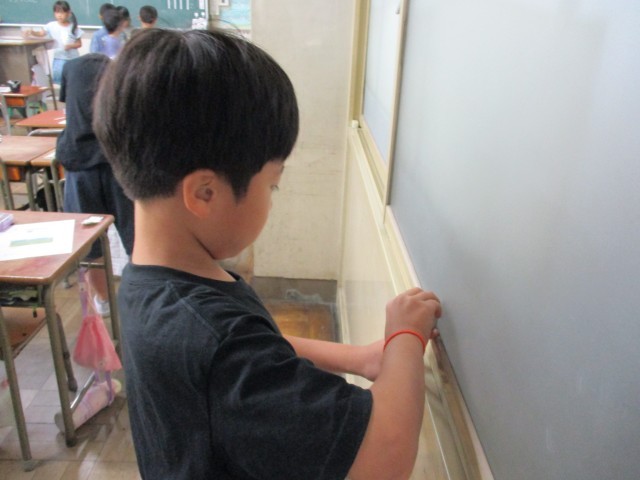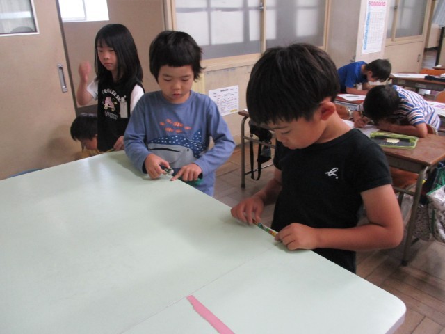 教室にあるものがいくつぶんか、長さを調べました。「えんぴつ3本分」「手のひらの5つ分」「けしごむは小さいから大変だね。」と気付きがいっぱいでした。