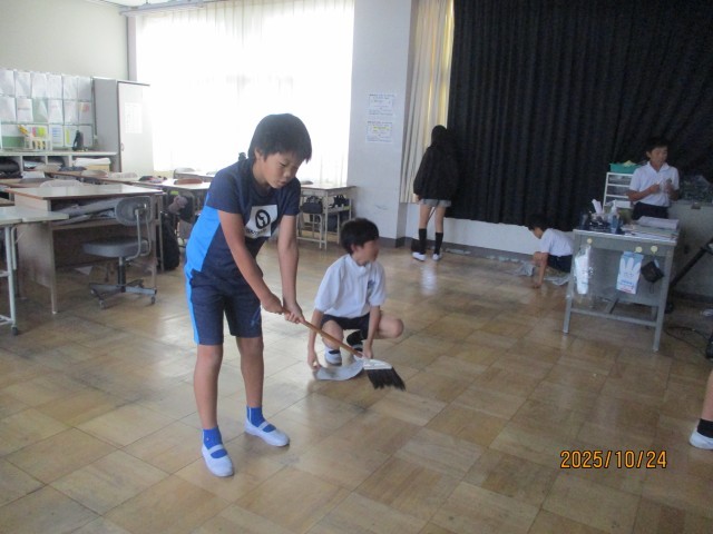 10/24 5年情報委員 清掃の時間 公開日 2025/10/27 更新日 2025/10/24 委員会活動 この記事は、5・6年の情報委員会児童が作成しています。この写真は、教室掃除の様子を撮影したものです。一週間の最後の清掃時間でした。協力して教室をきれいにしています。みなさん、お疲れ様です。