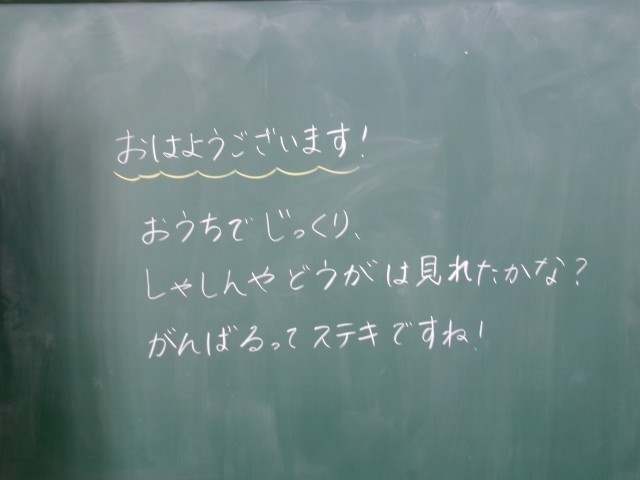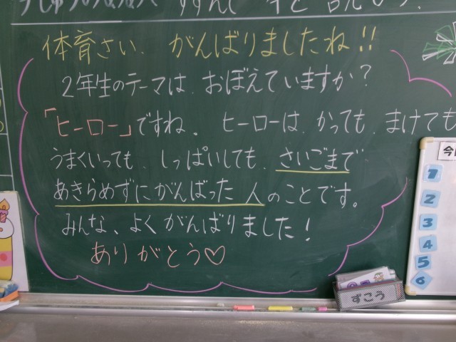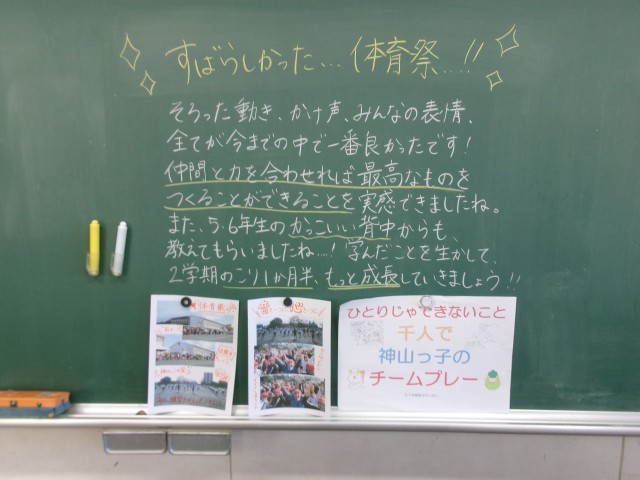 今朝の黒板のメッセージの一部です。「体育祭 よく頑張りました!」とお褒めの記載が多くありました。今回「なかまと協力すること」を学んだと思いますので、これからの学校生活に生かしてください。また、多くの参観者の皆さん、おやじの会・保護者ボランティアの皆様、ご協力ありがとうございました。※3枚目写真の「+」をクリックすると、それ以外のコメントも見ることができます。