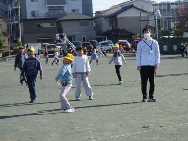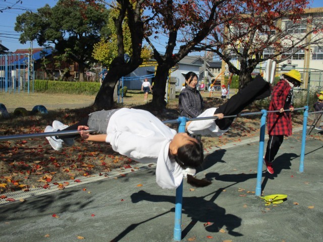ボールで遊ぶ子、鉄棒をする子、鬼ごっこをする子・・・。他にも落ち葉を拾って秋を楽しむ子がいました。今日はぽかぽか陽気で、元気な声が運動場にこだましていました。