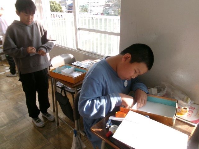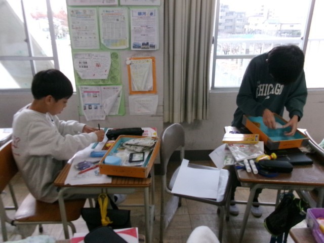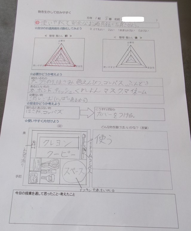 整理・整とんの手順を確認し、お道具箱の中を整理・整とんしました。必要なもの、あると良いもの、必要ないものに分け、仕切りや箱を作るなど工夫して、安全で使いやすいお道具箱になりました。