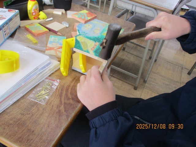 6年生が図画工作の時間にテープカッターを作っています。みんなで協力して、真剣に作っています。すてきなテープカッターができるといいですね。