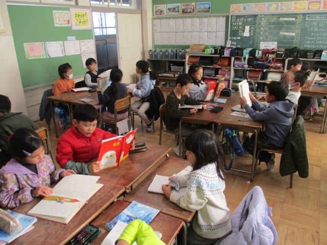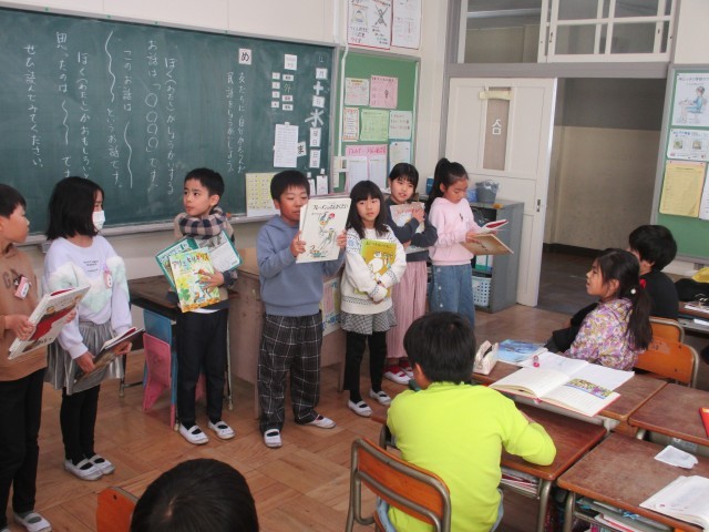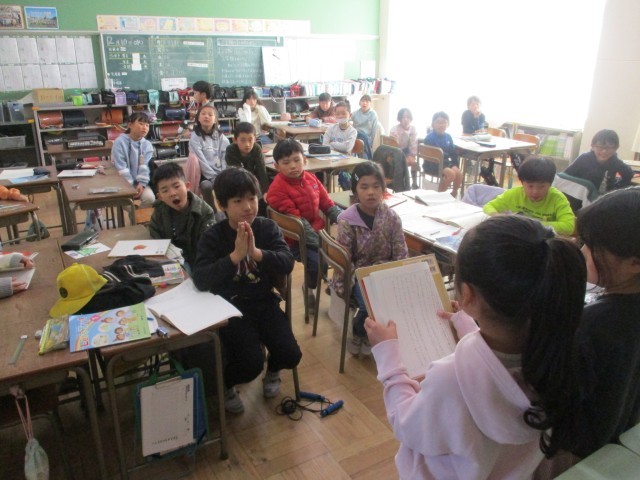 本日は国語科の「3年とうげ」の学習のまとめとして、世界の民話を読み、自分が面白いと思った民話を紹介する文章を書きました。書いた文章は班で読み合い、班の代表が学級の前で発表しました。