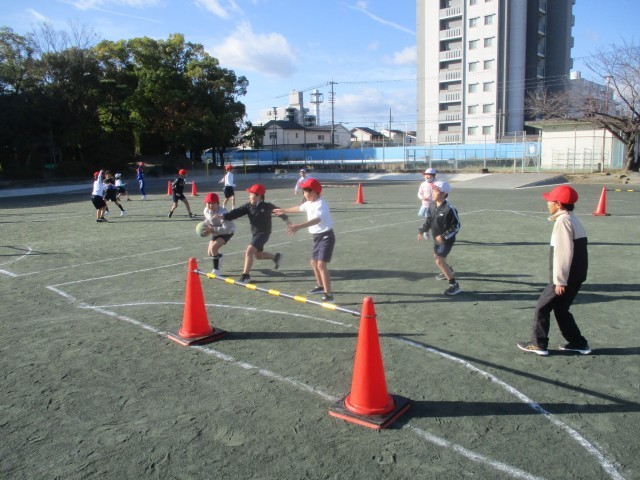 12/12 4年生 得点を狙う 公開日 2025/12/12 更新日 2025/12/12 4年生 ハンドボールの授業では、相手の守備をどうやったら、かわせるのか考えながら得点を狙いました。みんな楽しそうに活動しています。