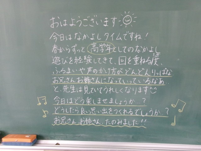 今朝の黒板のメッセージの一部です。「夢をかなえるゾウ!」「なかよし遊び・博物館見学」などの記載がありました。担任が子どもたちに気持ちを伝えることで、学級の絆が強くなります。これからも担任の思いや願いをくみ取れる子どもたちであってほしいです。※3枚目写真の「+」をクリックすると、それ以外のコメントも見ることができます。