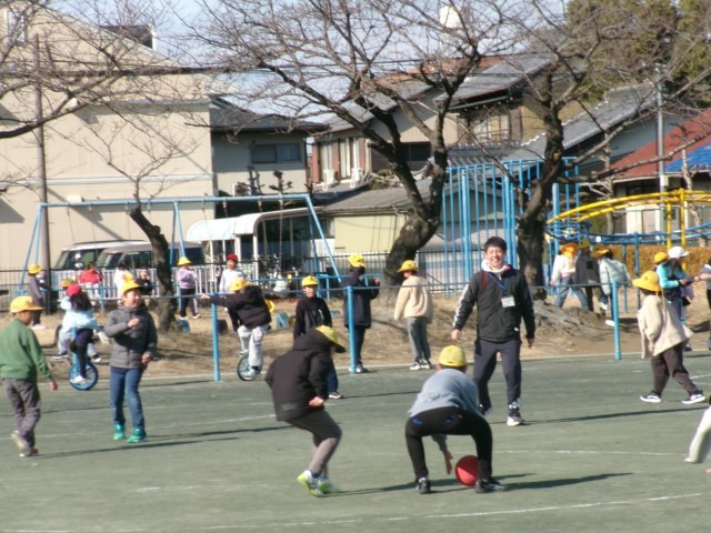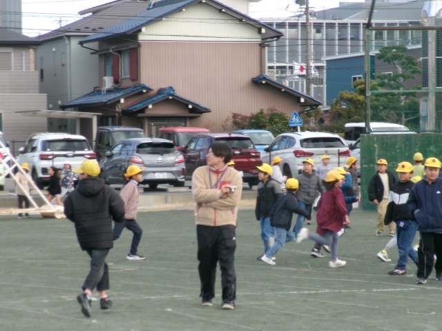 日差しがなく気温も低いですが、多くの子が運動場で走り回っています。また、子どもと一緒になわとびやドッジボールをしている先生が多くいました。6年生が小さな子と遊んでいる姿もありました。※3枚目写真の「+」をクリックするとそれ以外の笑顔が見られます。
