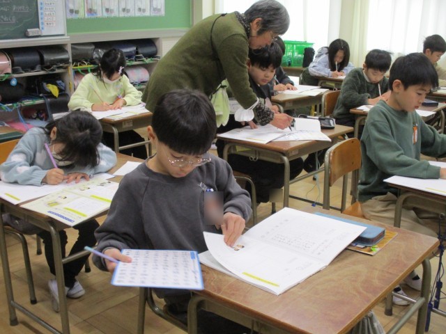 行の中心に文字の中心がくるように丁寧に書きました。みんな集中して書いていました。手が痛くなるほど、力を入れてゆっくりと練習している子もいました。