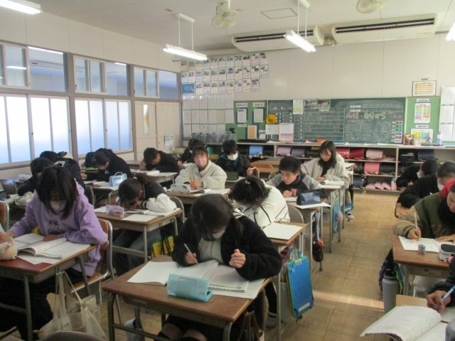 算数では、6年間の算数のまとめをしています。教科書で既習内容を確認しながら、プリントや発展問題にも取り組んでいます。積み上げが大切な算数だからこそ、ここで分からないものや忘れてしまっているものの復習をし、中学校へ向けて準備していきたいと思います。