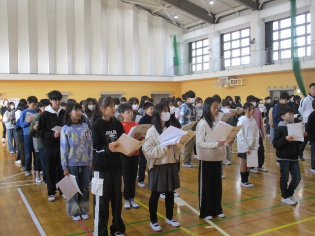 今日から卒業式に向けての全体での歌練習が始まりました。各クラスで練習してきたことを発揮しながら、一人一人が一生懸命に取り組みました。自信のない部分もありましたが、今日の練習で声の出し方やパートに分かれての練習を行う中で、確実に大きな声が出るようになってきました。まだまだ伸びしろが大きいので、これからの成長が楽しみです!