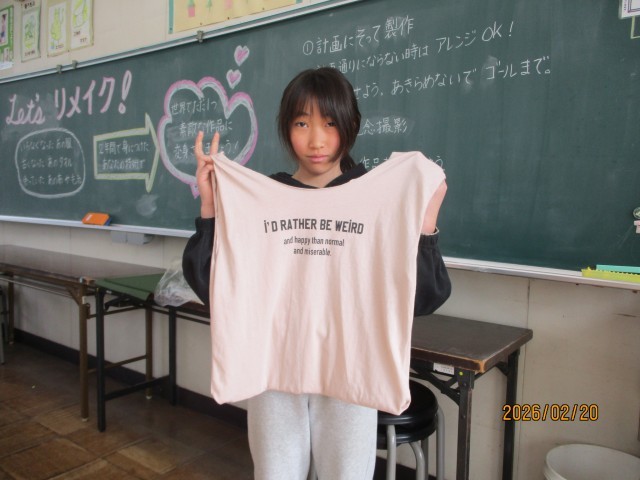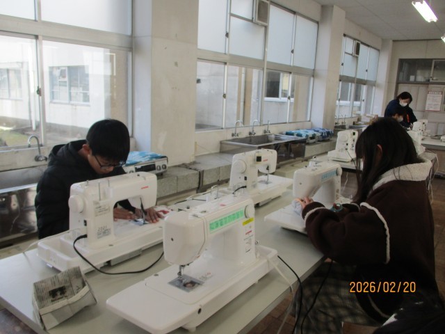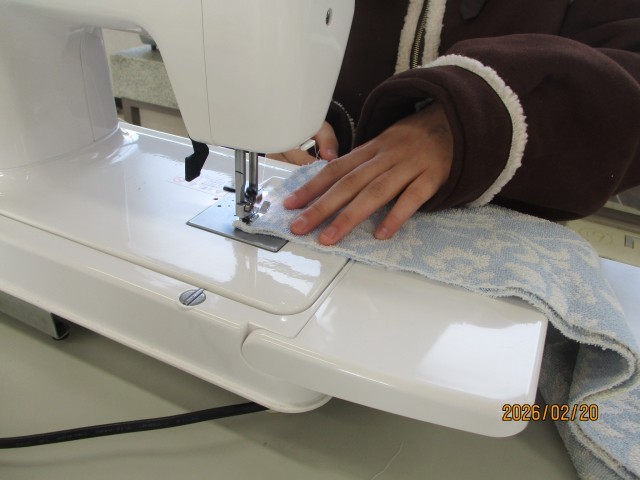 家庭科の授業で、ミシンを使って作成している様子です。昔大好きだった服などを、今でも使えるようにリメイクしています。全員とてもすてきな作品をつくることができました。