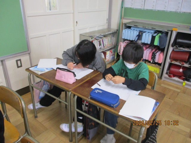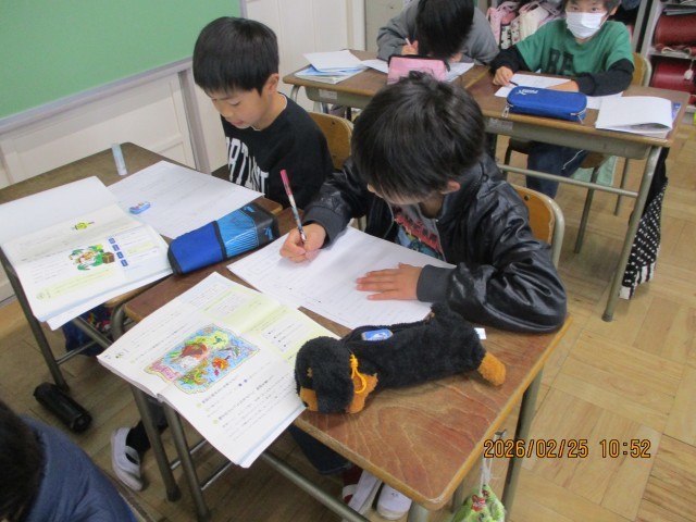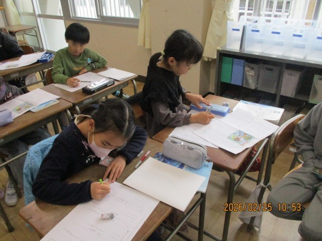 3年生は「たから島のぼうけん」という単元を行っています。この学習では、子どもたちが宝の地図を拾ったらどんな物語を描くかを考えて文章を書いています。はじめ、中、終わりの文章から物語を構成し、読んでいて面白いと思える文章を書いています。今後の活動がとても楽しみです。