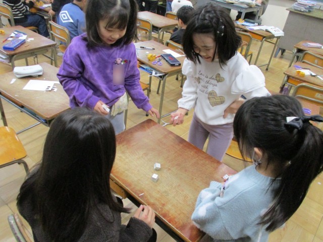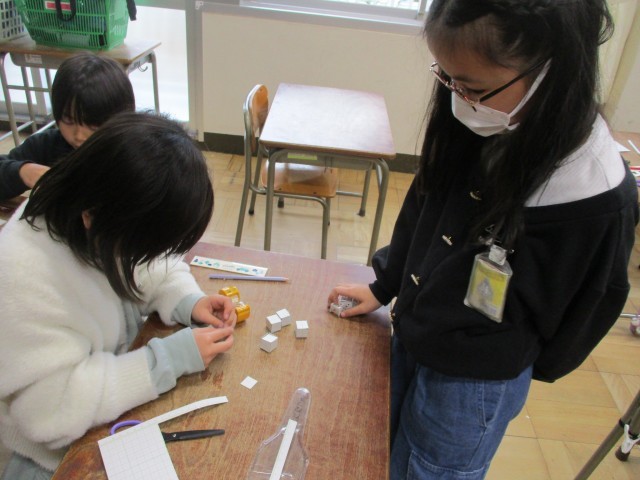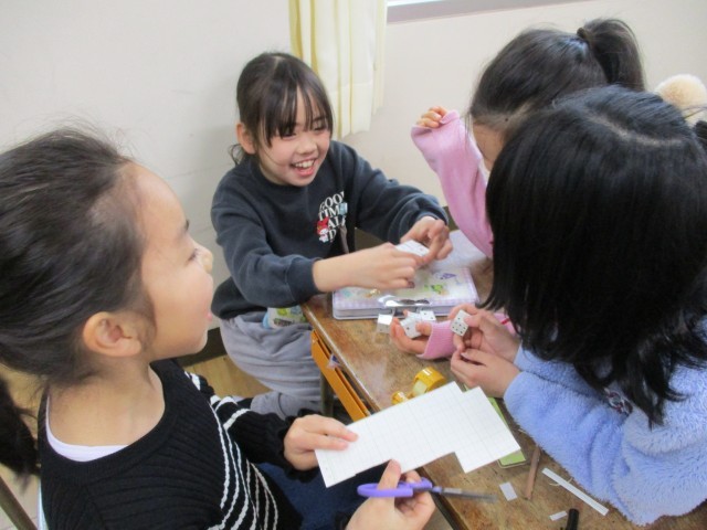今週の様子です。算数で「はこの形」の学習をしました。面の数や辺の数、頂点の数をしっかりと覚えることができました。今回はすごろくに使えるサイコロを作りました。サイコロの目を書いて楽しく作りました。