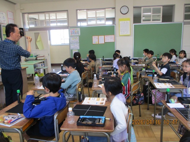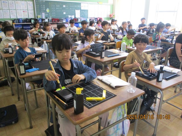 最初の書写の授業は、3年生から始まる毛筆について学びました。すずりや下敷きの置き方、筆の下ろし方など、実際に習字道具を手に取ってみんなで確認しました。次の時間は、筆に墨をつけて線を書く練習をします。