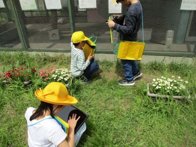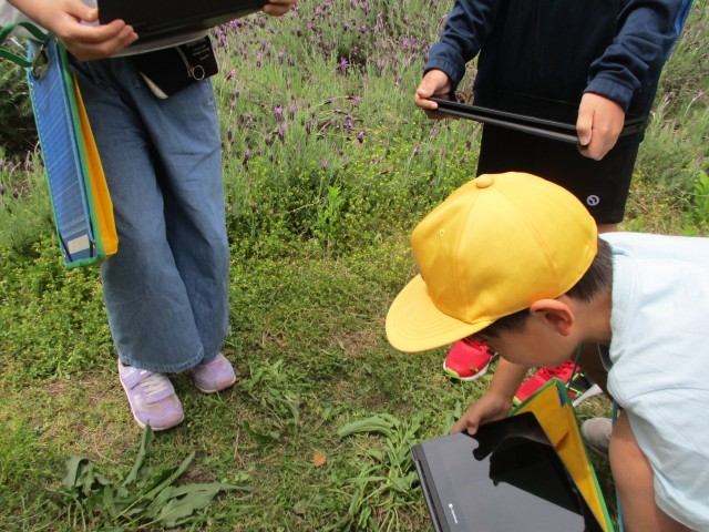 中庭へ出て、春の生き物を探しました。たんぽぽやダンゴムシなどを見つけ、写真に撮ってみんなに共有することができました。