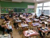 1年生は図工の時間に、自分の顔を描いています。目、鼻、口、輪郭・・・と進めていくうちに、とても表情豊かになってきました。顔ができたら、次は肩。これがなかなか難しいようです。自分の手を肩において、形を触って確かめたり、幅を確認したりしながら、描いていきました。「あれ。顔の幅より、肩のほうが大きいな。」大発見です。