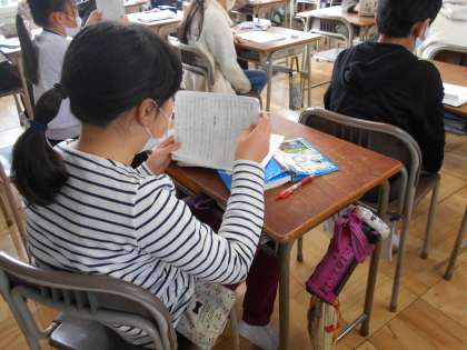 5年生の国語の授業で、「枕草子」を音読しています。何度も何度も口ずさみ、すらすら言えるように練習中。一人でつぶやいて練習したり、友達と聞き合ったりしながら、頑張っています。春、夏、秋と進んで、今の季節「冬は・・・」言葉の響きやリズムに馴染んできました。
