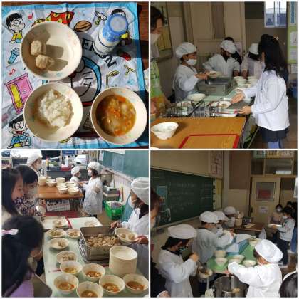 写真は1年生の準備の様子です。1学期のころは、大きいおかずだけ、先生がお盆にのせて配っていましたが、今では上の学年と同じように、一人一人お盆にとって、自分の席までもっていくことができるようになりました。みんなで協力して準備を進め、笑顔で「いただきます!」