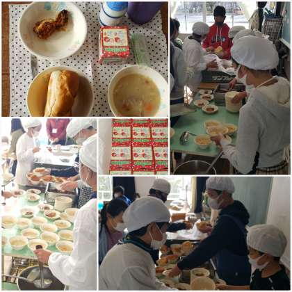 写真は、6年生の準備の様子です。今日はクリスマスメニュー!チキンもケーキも楽しみです。自分たちでどんどん進め、あっという間に準備完了。さすがです。笑顔で「いただきます!」