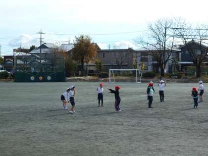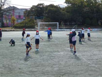 2年生が運動場で体育の授業をしています。昨夜の雪や今朝の凍結で、体育ができるか心配でしたが、お日さまのおかげでずいぶん渇きました。元気いっぱいで縄跳びをしています。仲間と声を掛け合って、技を磨いています。