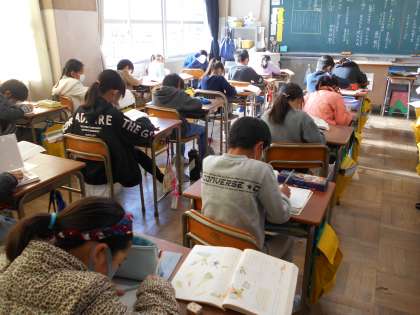 3年生の国語の授業で、「冬のくらし」の単元を学習しています。今日は、身の回りで見つけた冬を感じたものについて、絵日記風に文を書きました。自分が経験したことや想像したことなどから書くことを選び、どんどん書き進めていました。一人一人書くことが違っていて、自分ンの思いと向き合い、伝えたいことをわかりやすく書こうと頑張っていました。書き終わったら、挿し絵に進みます。ここで先生から「終わりです!」の声。「もうちょっとやりたかったぁ〜」とつぶやきながら、完成を楽しみにしている様子でした。