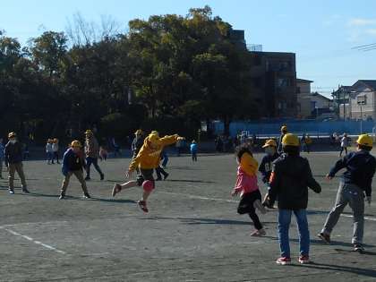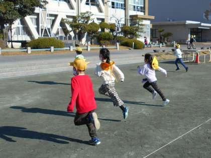 写真は、大放課の運動場の様子です。ドッジボールをジャンプして投げる、ジャンプしてよける、キャッチするのも全力ですが、動きはとても軽やか。走るのも全力ですが、とても軽やかです。温かな日差しのもと、全力で楽しんでいます。