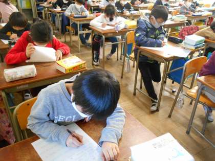 写真は、3年生の国語の授業の様子です。今日は先生からお手紙をもらいました。みんなへのメッセージが、何とローマ字で書かれています。習ったばかりですが、みんな一心に読んでいました。2学期にがんばったことが、たくさん書かれていました。読み進めながら、みんなにっこりになってきました。