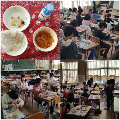 今日の給食は、配送が遅れたため、トラックが到着するまで、清掃や授業などを進めながら待っていました。トラックが到着したとの放送が入ると「わーい」と歓声があがっていました。落ち着いて待っていてくれてありがとう!!!