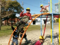 給食の時間が始まりました。今日の献立は、ご飯、牛乳、海鮮団子汁、138どんぶりの具、鬼まんじゅうです。