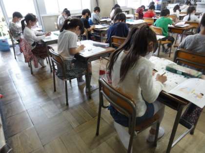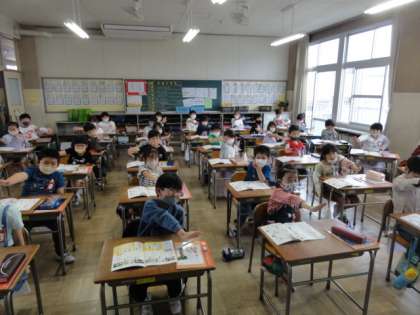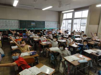 5/7 2年生 しょしゃの体そう?? 公開日 2021/05/07 更新日 2021/05/07 2年生 元気よく腕を動かして体操をしているようですが、書写の授業の様子です。 「しょしゃの体そう」という学習内容で、始筆・運筆・終筆について体を大きく使って学びました。 子どもたちは「とん」「すうっ」「ぴたっ」の合言葉とともに、楽しそうに取り組んでいました。 実際に字を書くときには、学んだことを生かしながら正しい姿勢で書くことができていました!