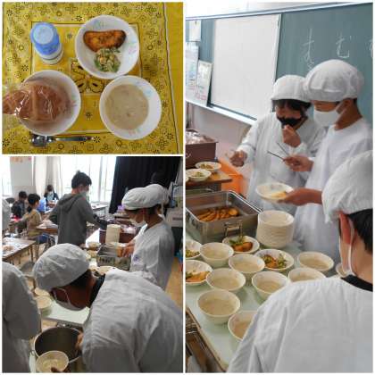 写真は6年生の準備の様子です。当番の配膳のスピードが速くて、すぐに配膳台がいっぱいになってしまいます。大きいおかずの当番と小さいおかずの当番が、あうんの呼吸(?)で置き場所を譲り合っていました。昨日の校外学習で、みんなで気持ちよく生活することを学んだ成果でしょう。