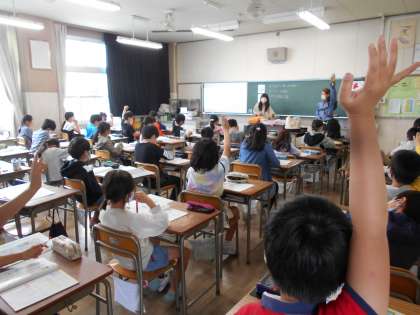 外国語活動の授業で、天気の表現を学習しました。チャンツなどで天気の言い方に慣れたところで、「Let's Listen 」に取り組みました。スクリーンを見ながら聞こえてきた英語を聞き取ります。最初は、「どんな天気のときにどんな遊びをするのか」でした。みんなが大好きな鬼ごっこやドッジ、トランプが出てきて、とっても簡単!次は、「天気が○○だから、△△を着ていこう」の内容です。「親が子どもに天気に合わせた衣類を着るように言う」という設定です。色の名前や衣類の言い方もちゃんとわかってばっちりでした!