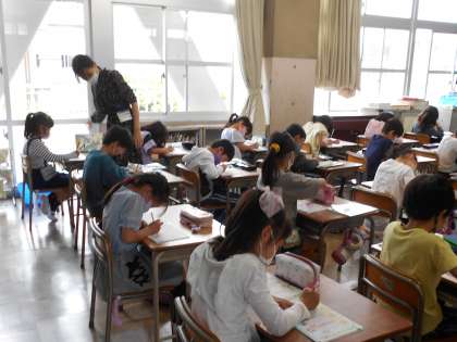 国語の授業で、新しく出てきた漢字の練習をしました。先生の字を書き順に気をつけながらしっかり見て、先生と一緒に空書きしました。読み方も何回かつぶやきながら練習したあと、ノートに実際に書いてみました。姿勢をピンとしたら、字もまっすぐピンとしてくる気がします。バランスに気をつけて丁寧に書きました。