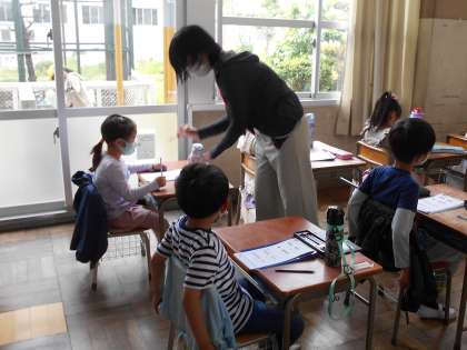 1年生の算数の授業では、「5までのかず」を学習しています。今日は4を分ける学習をしました。先生と一緒に問題を解いた後、ノートの問題に取り組み、答えをノートに書きます。数字も、習った書き方を思い出し、枠の中に丁寧に書きました。先生に赤丸をつけてもらってにっこりです。そのあと、5を分ける問題も自信をもって取り組みました。頭フル回転で頑張っています。